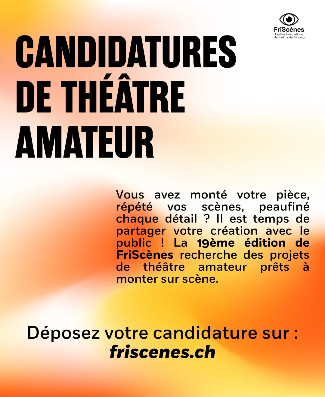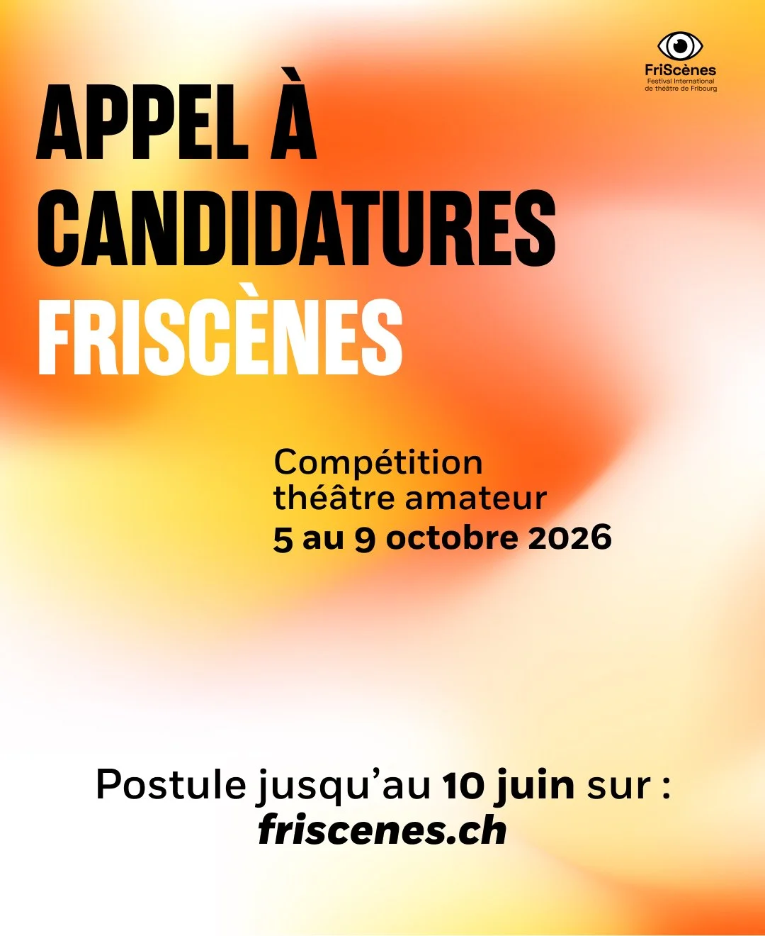 APPEL À PROJETS - COMPÉTITION THÉÂTRE AMATEUR - APPEL À PROJETS - COMPÉTITION THÉÂTRE AMATEUR - APPEL À PROJETS - COMPÉTITION THÉÂTRE AMATEUR - APPEL À PROJETS - COMPÉTITION THÉÂTRE AMATEUR - APPEL À PROJETS - COMPÉTITION THÉÂTRE AMATEUR - APPEL À PROJETS - COMPÉTITION THÉÂTRE AMATEUR - Le règlement 2026 de FriScènes est disponible ici : drive.google.com/file/d/1n-xBbm0MXRa28sKChyL4XiT3inTN90Ir/view?usp=sharingLe délai de dépôt pour les candidatures est fixé au 10 juin 2026 (inclus).